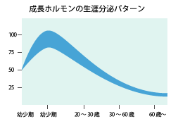 成長ホルモンは加齢とともに低下してきます。思春期前の値を100%とすると成長ホルモンの分泌量は、思春期後期で多くなり、200%と2倍くらいになります。 その後はどんどん少なくなり、30、40歳台では50%、60歳では30%くらいになります。