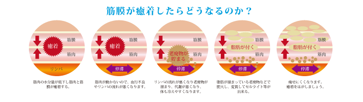 | 例えば、筋膜が筋肉と癒着しシワができると筋肉が圧迫され収縮してしまいます。その結果、体が歪み、リンパや血管の流れが阻害され、老廃物を排泄しにくくなり、コリや痛みが生じ、セルライトや脂肪が成長し、更に代謝が悪くなるので、太りやすく痩せにくい体質になってしまいます。 |